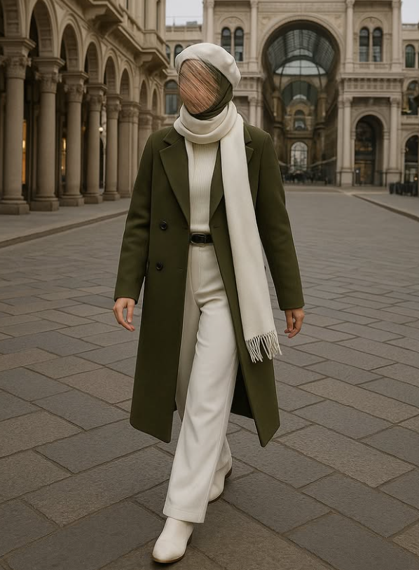يتكوّن من جاكيت طويل بلون زيتوني أنيق، قميص داخلي ناعم، بنطلون بقصّة مستقيمة، حزام يحدد الخصر، شال كلاسيكي، وقبعة أنيقة تكمل الإطلالة.